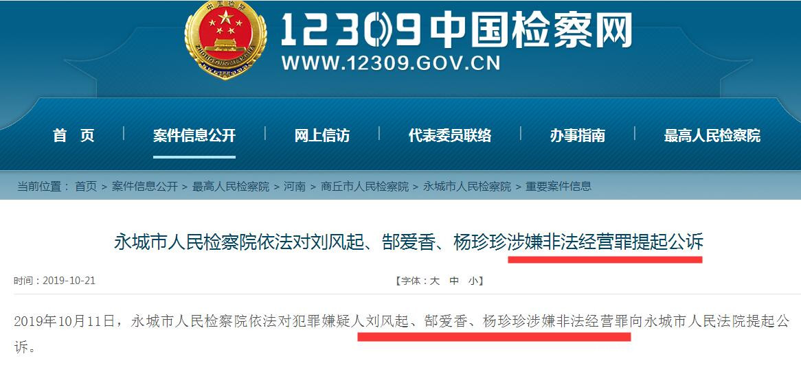 2019年10月11日,永城市人民檢察院依法對犯罪嫌疑人劉風起、郜愛香、楊珍珍涉嫌非法經營罪向永城市人民法院提起公訴。