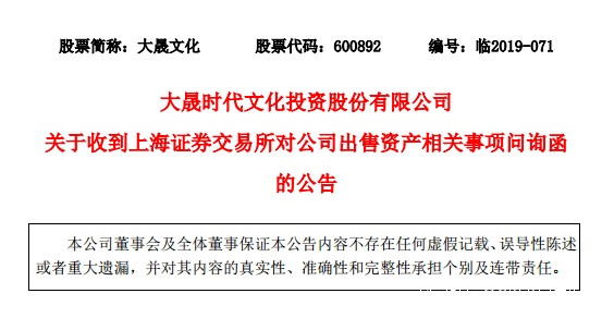 2019年12月10日,大晟文化發佈關於收到上海證券交易所對該公司出售資產相關事項問詢函公告。