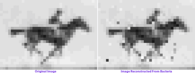 比如,哈佛大學的研究人員把一張騎馬的動圖,插到了大腸桿菌的DNA裏。