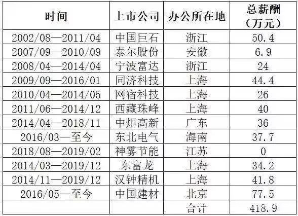新京報報道稱,錢逢勝已從這些上市公司至少獲取了418.9萬元的薪酬(注:剔除個別沒有披露獨董薪酬的年度報告)。其中,給出薪酬最高的是在香港上市的中國建材,其獨立非執行董事每年年薪達30萬元,而錢逢勝從2016年5月至今,已合計從中國建材獲取薪酬77.5萬元。
