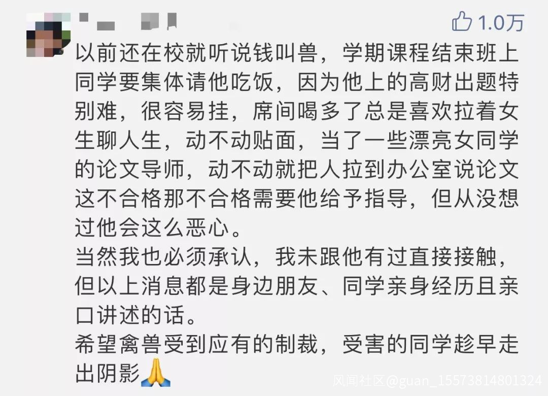 隨着輿論發酵,越來越多的人站出來揭露錢逢勝的醜惡嘴臉——性騷擾女學生、強迫學生請客吃飯,如果有人反抗舉報,他就以“掛科”“不能順利畢業”作要挾。