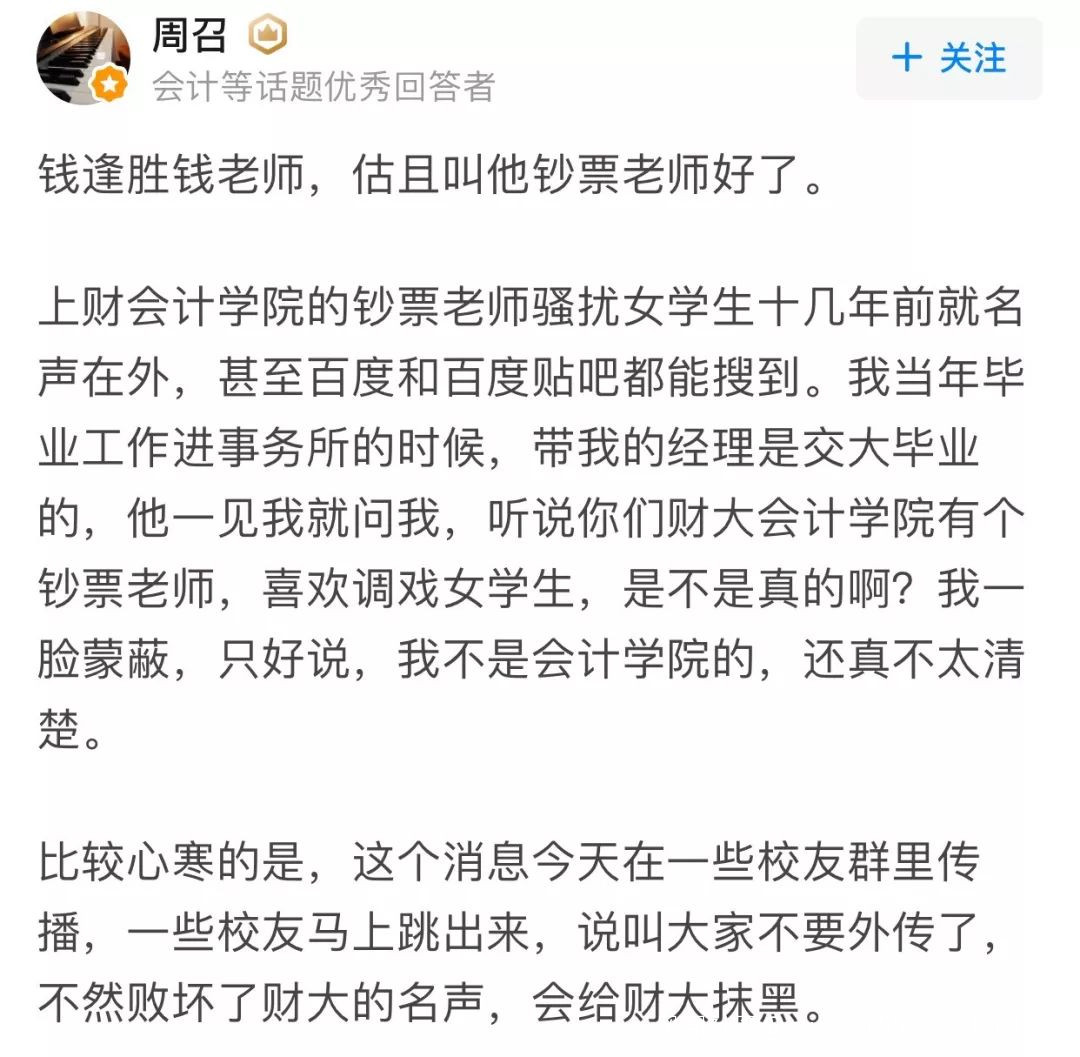 在知乎上,有實名回答者指出,錢逢勝的惡臭事蹟甚至連校外同行都有所耳聞。