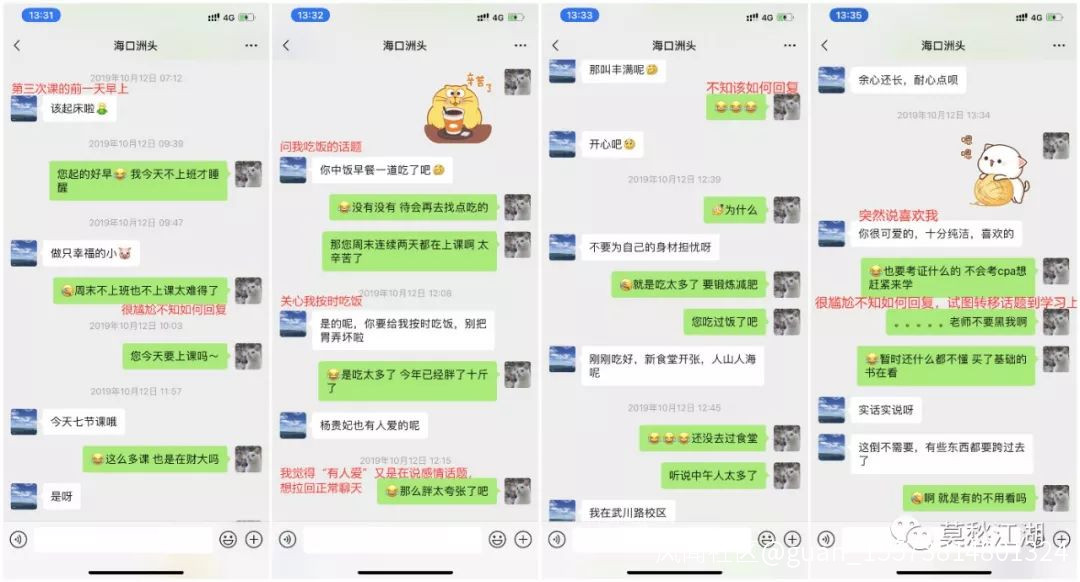 小文倍感不安。但因為害怕得罪老師,她也不敢直截了當地拉黑他,而是一次次地説“不要逗我了”“瑟瑟發抖”“您能不能不要再這麼説了”……