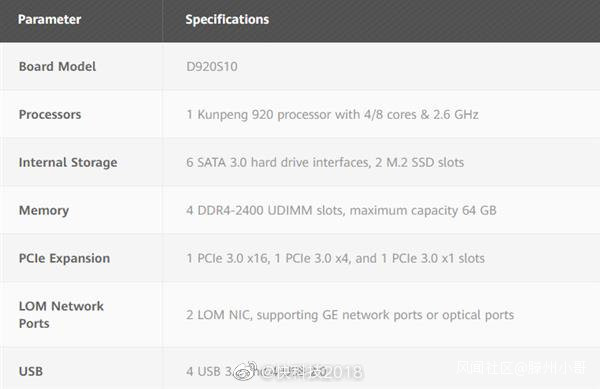 在其他配置方面,主機內自帶2GB獨顯(型號未知),同時也提供四條DDR4-2400MHz(標配8GB,最高64GB)內存插槽,擁有6個SATA 3接口,同時還有M.2 2280/22110 SSD擴展接口、M.2 2232插槽(可擴展無線模塊),在華為鯤鵬主板底部有PCI-e 3.0×16、PCI-e 3.0×4和一條PCI-e 3.0×1插槽。