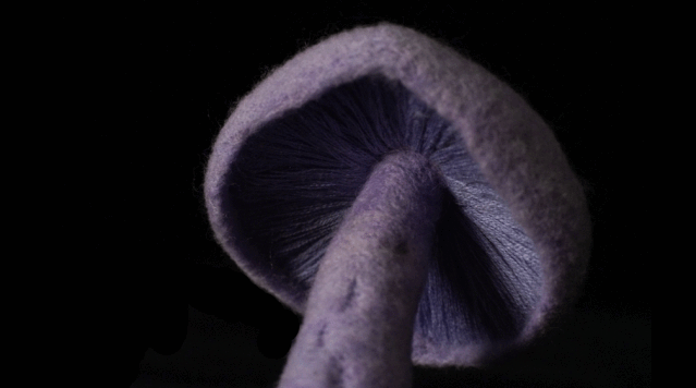 我想用羊毛和其他的纖維材質,儘量去表現植物和動物的生命感。這是展上的一些作品。我當時是按照1:1的大小製作出這些真實存在的蘑菇。