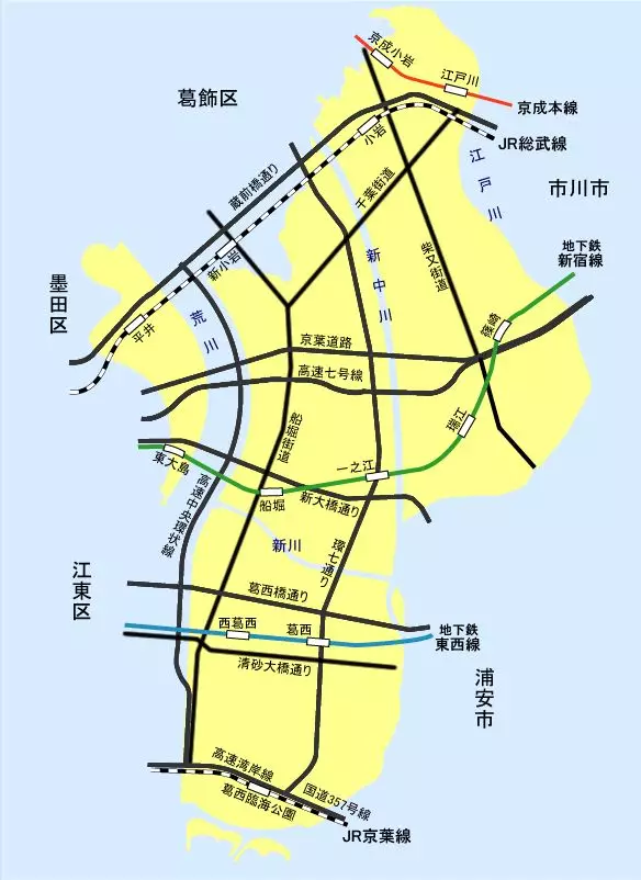 緊貼葛飾區新小巖一側的江户川區也是鐵道匱乏的地區之一,目前經過其境內的有京成本線、JR總武線、都營新宿線、地鐵東西線和京葉線,缺乏縱向連結,整體人口分佈也較為稀疏。