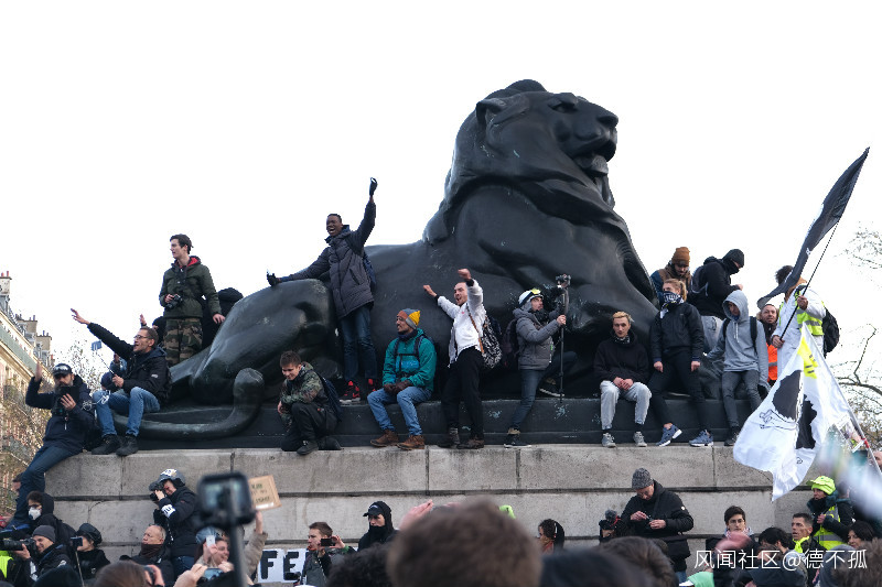 示威至此刻,示威人羣已逐步到達了丹費爾-羅什洛廣場(Place Denfert-Rochereau),也就是本次遊行的終點。在這裏,很多示威者爬上矗立在廣場的雄獅雕像,揮舞着手中的旗幟,和雕像下方的示威人羣一起呼喊口號,高唱“On est là, on est là, même si Macron ne veut pas, on est là!(我們在這裏,我們在這裏,即使馬克龍不情願,我們在這裏!)”。周圍的警方密切注視着眼前的一切,一方極力點燃氣氛,一方則極力保持冷靜,這樣的場面在我經歷過的幾次示威中從未見過。
