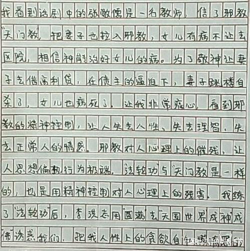 還有一些犯人看完話劇心情久久不能平靜專門寫了觀後感用自身經歷告誡大家遠離邪教。
