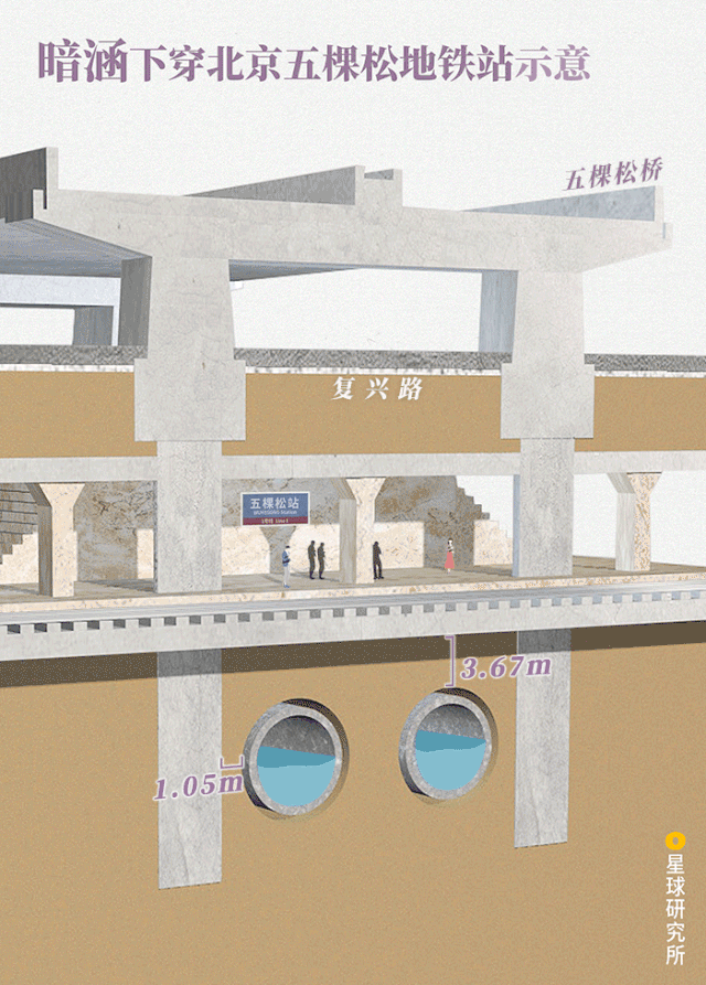 (北京五棵松地鐵站縱向結構示意,製圖@陳睿婷/星球研究所)