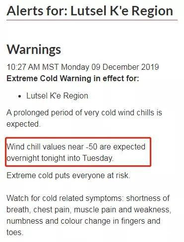 加拿大西北地區氣温將降至-50°C。