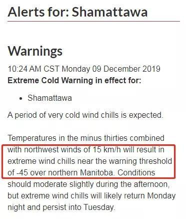 而在曼尼托巴省的六個地區,也將迎來嚴寒,-30°C的氣温再加上15km/h的寒風,會導致曼省北部的體感氣温下降至-45°C,加拿大環境部預測。