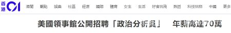 據香港01報道,美國駐港澳總領事館昨天(12月12日)在FB公佈招聘訊息,其中一項是“政治分析員”,年薪由45萬至70萬不等,即最高月薪近5.89萬。