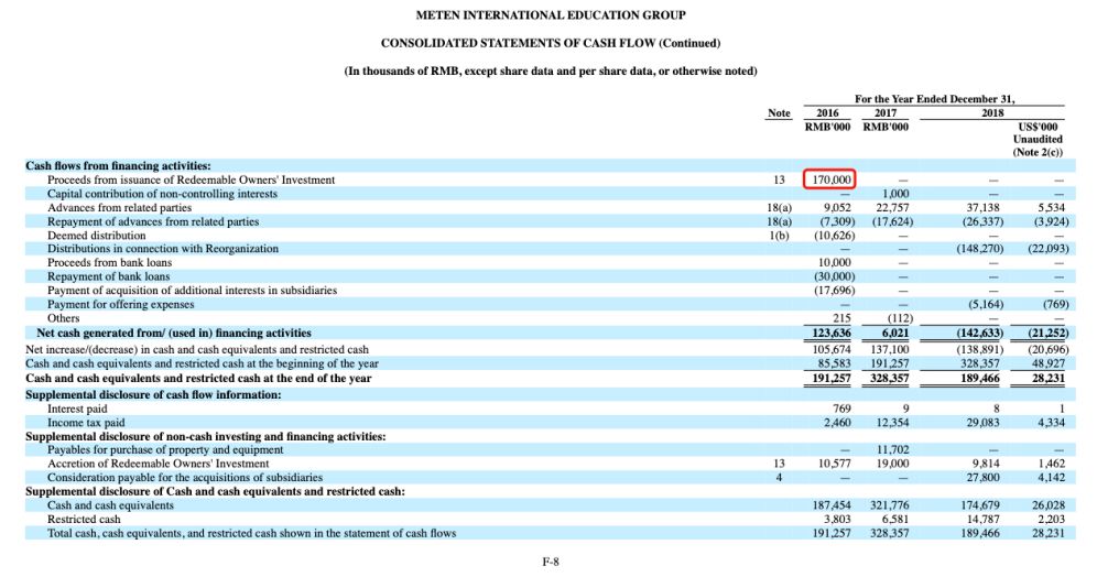 相反,2016年美聯英語獲得過一次1.7億元的融資,在籌資活動現金流量一覽中,是有體現的。