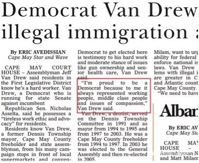 新澤西選出的眾議員,民主黨的範.德魯宣佈叛黨。