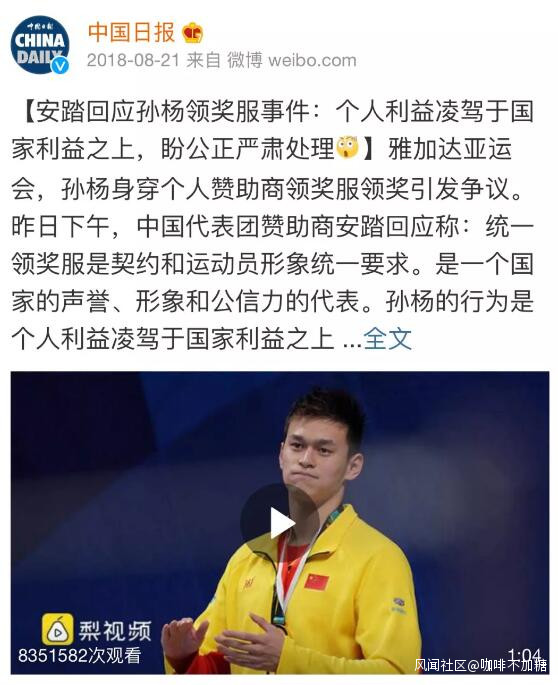 但是,孫粉們可能選擇性地無視了,一個不算小的插曲:8月19日進行的亞運男子200米自由泳項目決賽上,孫楊摘得冠軍,完成了自己在該項目奧運會、世錦賽、亞運會、全運會以及冠軍賽的大滿貫,一時風光無限。但上台領獎時,一同領獎、奪得銅牌的隊友季新傑,穿着的是國家隊贊助商安踏的服裝,孫楊身穿的黃色服裝上,清晰可見卻是361°商標。接下來在20日晚的頒獎儀式上,孫楊雖然穿上了安踏的領獎服,卻用國旗圖案的貼紙遮蓋了商標,並且還身披國旗遮住了服裝的商標部分。