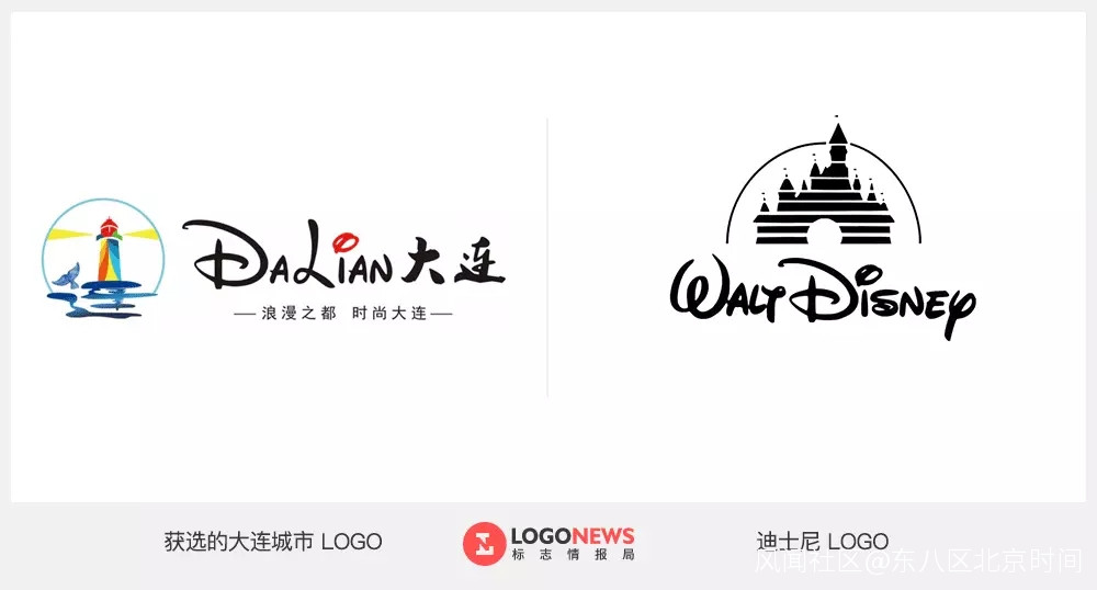 該媒體把獲獎的大連城市LOGO與迪士尼的LOGO並排放在一起↓↓