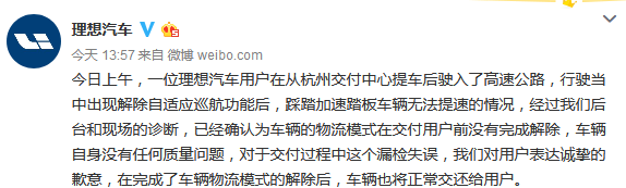 官方表示,在理想汽車設定的物流模式下,為了保障運輸過程中的車輛安全,人為踩動加速踏板只能達到30km/h的車速,但在物流模式下車輛啓動自適應巡航功能,時速可以超過30km/h車速。在用户解除自適應巡航後,由於仍然處在物流模式,無法通過加速踏板進行30km/h以上的加速。