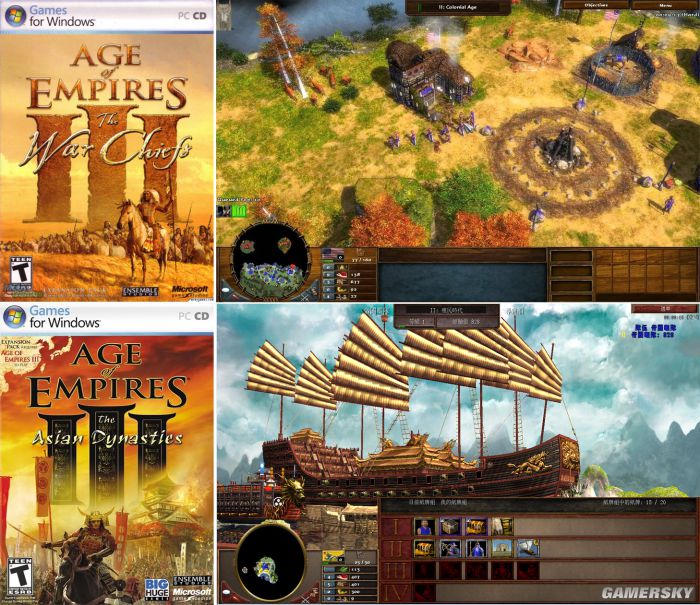 之後的兩款資料片《酋長》和《亞洲王朝》。前者添加三支美洲土著,阿茲特克人、易洛魁聯盟和蘇族,彼此間各有特色,圍着篝火跳舞也有趣。後者新增三個亞洲國家,印度、日本和中國,相互之間差別更明顯。版本更新到這兒,《帝國時代3》才算真正有了些傳統風味,體現出人類文明的不同與多變。