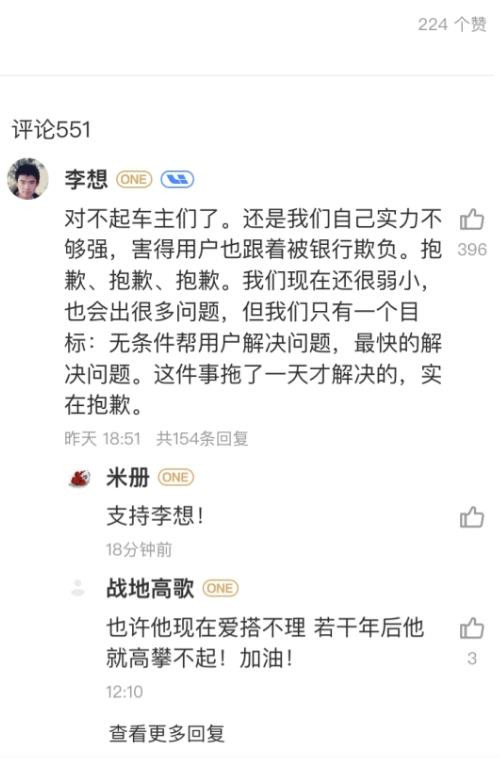 李想表示:“對不起車主們了。還是我們自己實力不夠強,害得用户也跟着被銀行欺負。抱歉、抱歉、抱歉。我們現在還很弱小,也會出很多問題,但我們只有一個目標:無條件幫用户解決問題,最快的解決問題。這件事拖了一天才解決的,實在抱歉。”