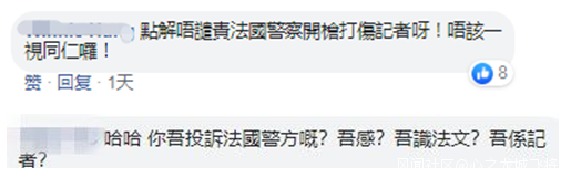 此次香港記協這篇洋洋灑灑的“譴責聲明”發出後,有網友對此諷刺:為什麼不譴責法國警察打傷記者呀,一視同仁嘍!你不投訴法國警方?不敢?不認識法文?不是記者?↓