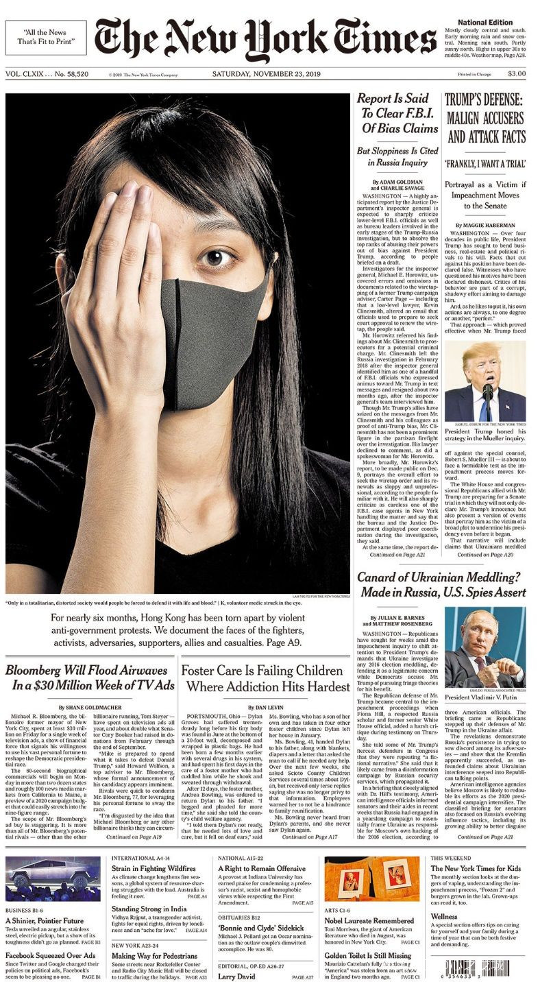 但值得玩味的是,就在11月24日香港區議會選舉的前一天,“爆眼女”又再度出現了:美國《紐約時報》以頭版刊登了她的照片,幾乎佔據版面的一半(上圖)。照片中,她身穿黑衣、面戴黑口罩,以右手掩蓋其右眼。圖片的説明只有一句聲稱是她講出的政治口號,但所謂的“採訪”沒有半句解釋當時事發的情況。為何消失已久又疑點重重的“爆眼女”會在選舉前一日再度現身?答案恐怕已不言自明。
