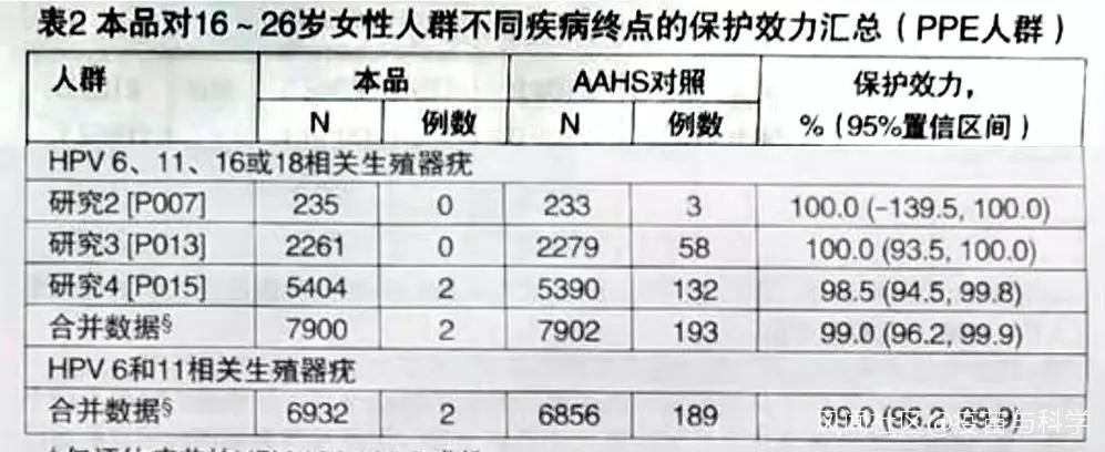 這3項國外研究合計有近1.6萬名女性參與。在接種疫苗的7900人中只有2人罹患尖鋭濕疣,接種安慰劑組7902人有193人患病,可見4價疫苗對尖鋭濕疣的保護率達到99%。