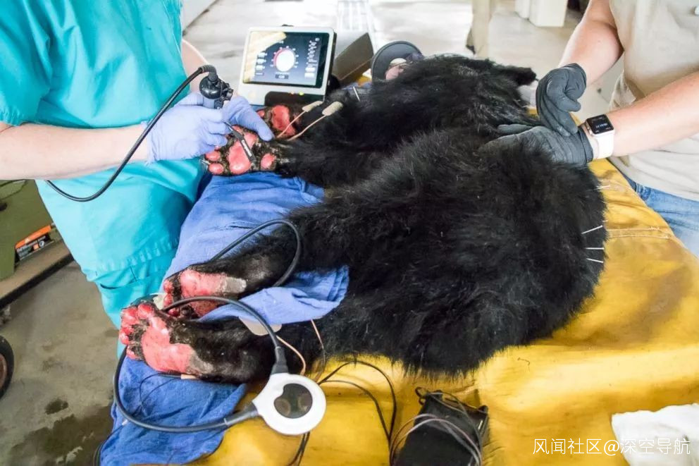 熊掌被嚴重燒傷在此之前,美國無論是人還是其他動物,都沒有使用魚皮治療燒傷的先例。佩頓自然也沒想到這個方法,她嘗試用常規的護理方法,先清理灼傷,清除死組織並塗上藥膏。但接下來,覆蓋燒傷表皮和止痛這兩個步驟進行得異常艱難。這些不同尋常的病患完全不會配合救治工作,它們在劇烈的疼痛下暴躁不安,而且未必會吞下隱藏在食物中的止痛藥。更有甚者,它們還可能撕咬並吃下纏在爪子上的繃帶,造成腸梗阻。而它們的傷口大概需要四到六個月才能痊癒,期間還需要不斷地更換藥物和紗布。每一次都是病患的煎熬,也是獸醫的艱難。