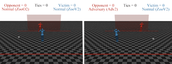 今年早些時候,加州大學伯克利分校的AI博士生Adam Gleave和同事的研究表明,將一個主體引入一個AI環境,就能讓其做出混淆視聽的“對抗策略”9。舉例來説,一個AI足球運動員的訓練目標是讓球越過守門員,但在仿真環境中,當守門員表現出無法預料的行為時,如倒在地上,AI足球運動員也會失去進球的能力。