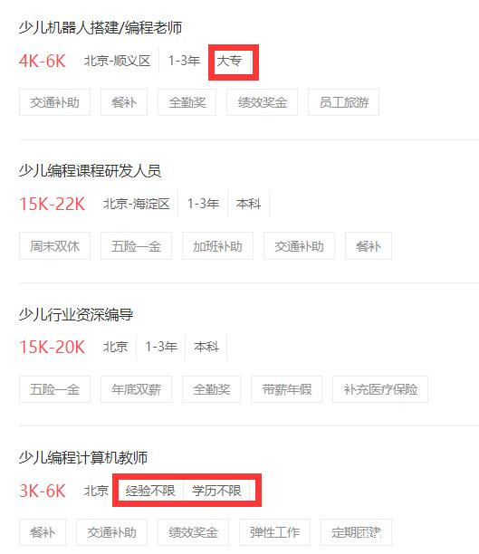 從招聘網站上的相關信息來看,教育機構對少兒編程教師的要求很低——學歷在大專以上即可,甚至不需要有相關經驗。而且工資跨度極大,月薪從3K到20K左右。這很容易導致少兒編程企業的教育水平相差較大,對學生的學習質量造成極大影響。如此不負責任且短視的做法,自然讓少兒編程難以受到更多家長的青睞。