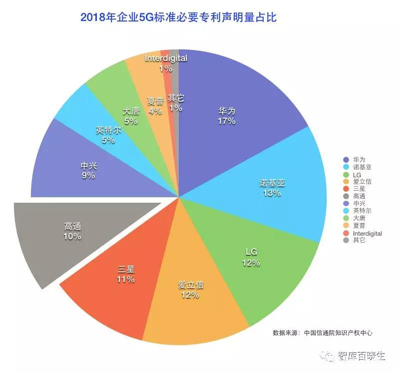 根據中國信通院的最新統計,在通信企業5G標準必要專利(SEP)聲明量排名中,華為最高佔17%,而高通為10%。