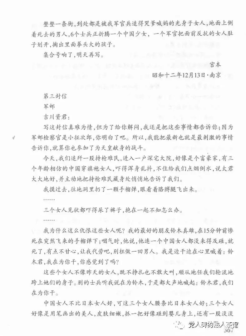 1937年12月16日,一名叫宮本的日軍大尉,給因殘疾不能服兵役,而留在家鄉的朋友吉川資,寫了幾封信,主要內容就是這幫畜生的“性犯罪”。