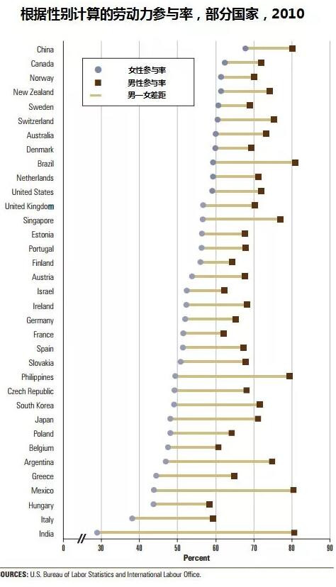 2017年,美國統計局數據顯示,中國女性的勞動參與率高達68%,超過大多數發達國家。但這個圖表不能顯示女性就業方向與男性的差距,更不能反映出同一工種下男女的薪酬差距。