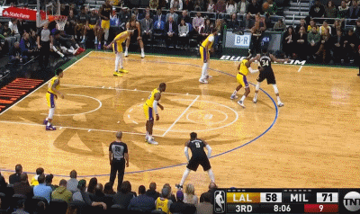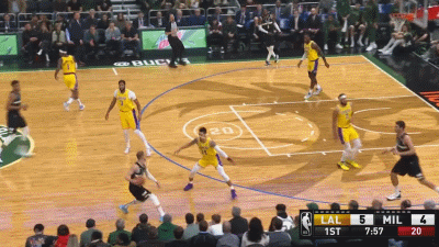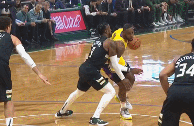 比如下面這個防守,先由字母守住了湖人第一次擋拆,再由字母守住詹姆斯的突破,然後迪文欽佐和字母將詹姆斯逼到底角,老詹傳出球以後,迪文欽佐回到側翼封堵隆多,並將他“護送”至大洛佩斯手裏——