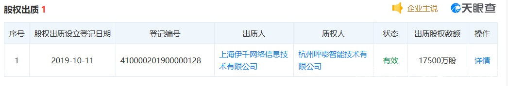 另外,據GPLP犀牛財經瞭解到,今年10月11日,中原消費金融發生一則股權出質,出質人為第二大股東上海伊千網絡信息技術有限公司,質權人為杭州呯嘭智能技術有限公司,出置股權數額為17500萬股。