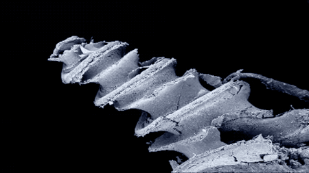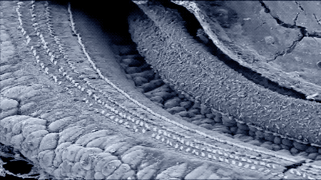 在內耳裏有一些神奇的結構。你看到的這個東西,是電子顯微鏡下的耳蝸,長得就像神奇海螺,它們能夠採集聲音。
