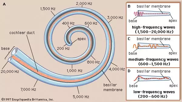 其中,感受高頻聲波,也就是高音的細胞更早死。負責高音的毛細胞長在耳蝸的基底部,耳蝸頂部的毛細胞主要負責低音。這種結構叫做頻率拓撲(tonotopic organizaion)。