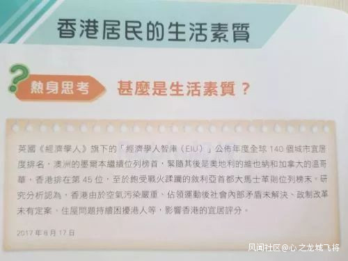 課本一開始就提到香港在全球宜居城市中排第45位,而排名受到了“空氣污染”、“社會內部矛盾”、“政治環境”以及“房屋問題”的影響。