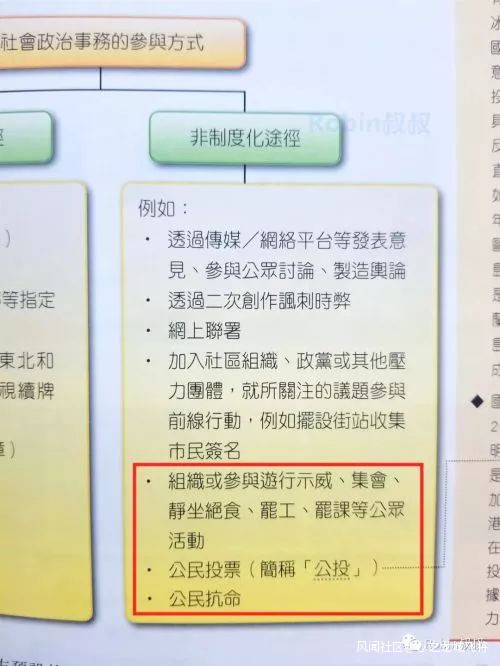 在“參與社會及政治事物的方式”這一章,有一類叫做“非制度化途徑”。