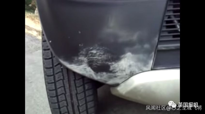 事主下車查看了一下,發現車的保險槓似乎被撞出了點痕跡。真的是鐵豬鼻了…..