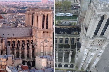 左邊為完好的聖母院,右邊為燒燬後的現場