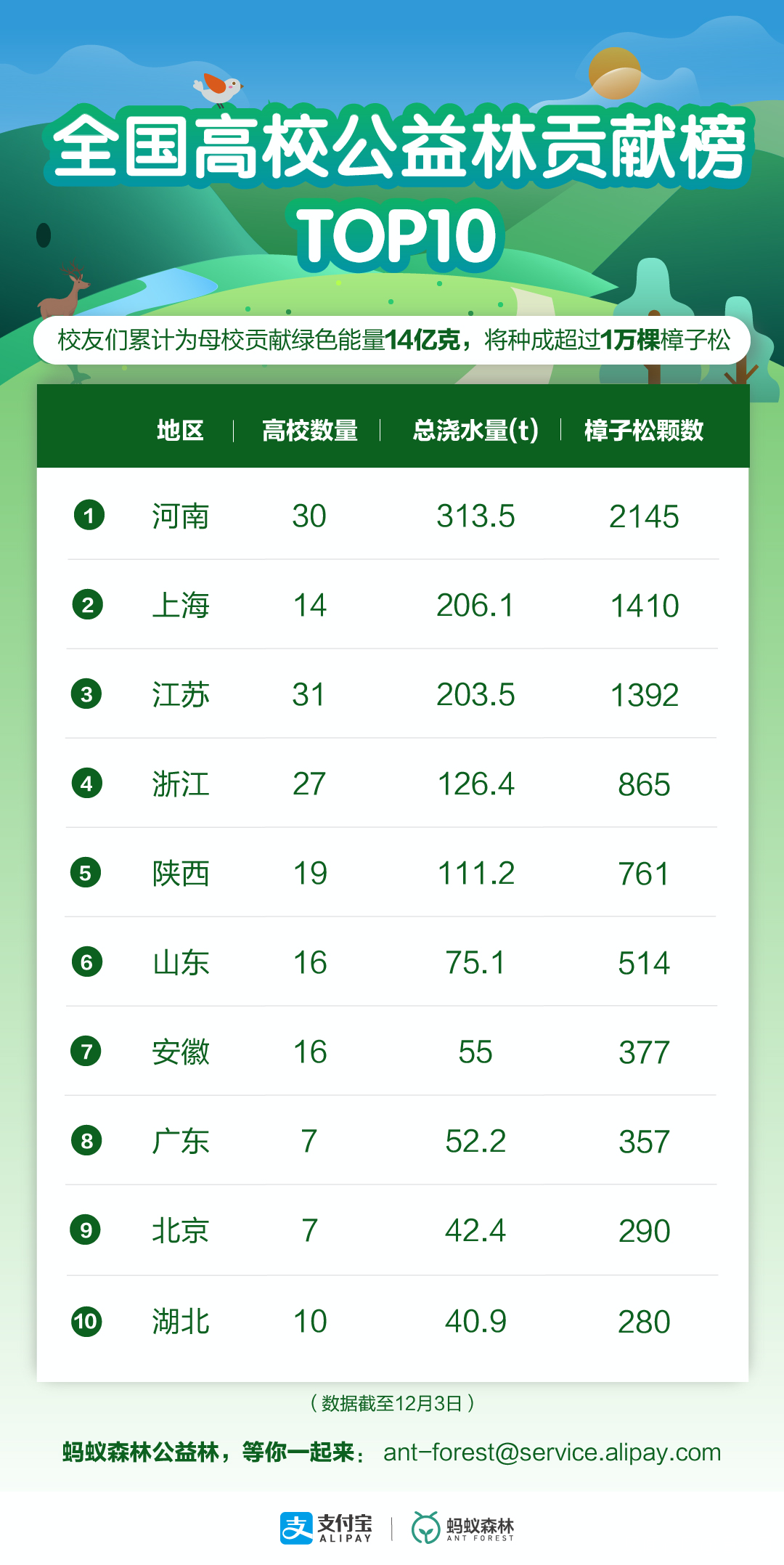 自今年6月上線以來,支付寶螞蟻森林已經有近300所高校加入種樹,校友們累計為母校貢獻綠色能量14億克,將種成超過1萬棵樟子松。目前,上海市已有復旦大學大學、同濟大學、上海交通大學等14所高校開通公益林,累計澆水量超過2.06億克,排名全國第二,相當於種下了1400多棵樟子松。和校友們一起在螞蟻森林裏給母校種一片公益林,成為許多人生活中的日常。