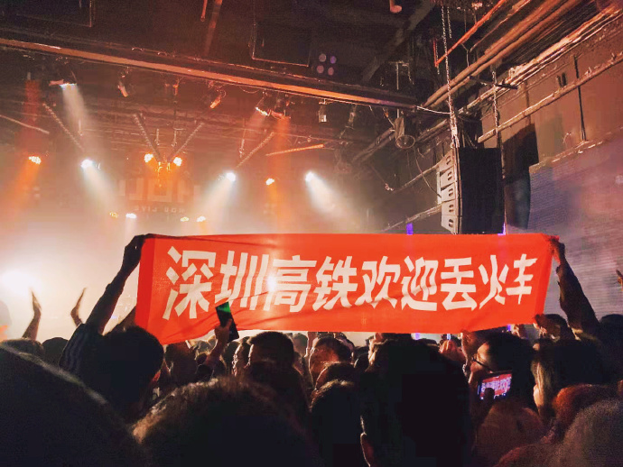 結果演出現場,有歌迷舉起了這麼一條橫幅——“深圳高鐵歡迎丟火車”。
