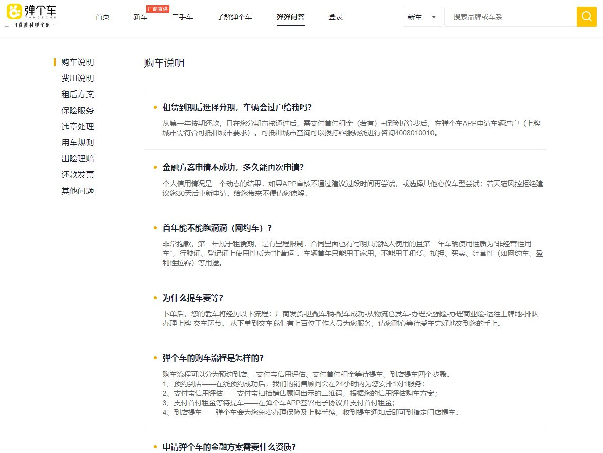 對此,GPLP犀牛財經還曾查詢彈個車的官方,發現在網頁的項目欄中,專門設有“彈彈問答”,並針對購車説明、費用説明、租後方案、尾款處理、還款發票等10個方面,都有專門的解答,足見彈個車對用户的重視。