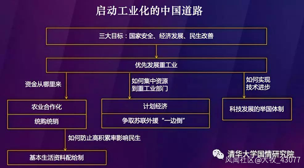 比如説,當時既要實現國家安全,又要實現經濟發展和民生改善,那就必須首先發展重工業。單純從經濟邏輯上説,一個落後的農業國應該先搞輕工業和來料加工,慢慢積累再搞產業升級,但是在當時西方國家架兩門大炮就可以俘虜我們的時代,中國連基本的生存都解決不了,輕工業和農業也沒有辦法獲得原料、能源的支持,怎麼可能搞輕工業優先呢?而重工業需要大量初始投入,中國是一個小農經濟汪洋大海的國家,怎樣積累資源呢?