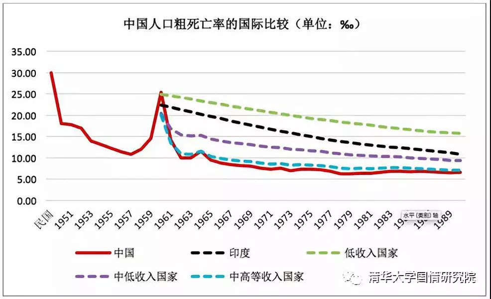 從人口的死亡率來看,即使是在1960年,中國人口死亡率最高的時候也低於建國前、低於當時低收入國家水平。三年困難過去之後,死亡率迅速降低到和當時高收入國家相接近的水平。