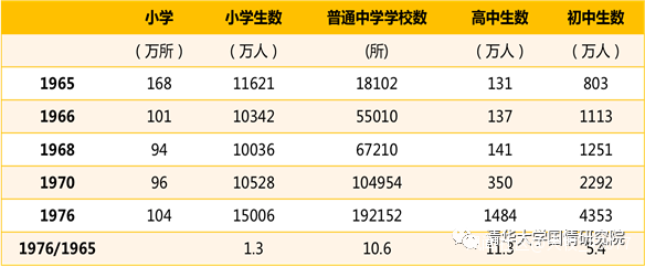 同時要看到的是,改革開放之前,從1965年到1978年,基礎教育特別是高中教育規模大踏步地擴張,高中生數量從1965年的131萬人增加到1978年的1484萬人,十多年增長了十多倍。