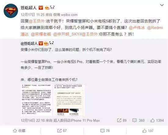 12月14日,科技博主笪屹超人發佈微博:“榮耀小米你們別吵了,這麼簡單的問題,拆個機不就完了嗎?”