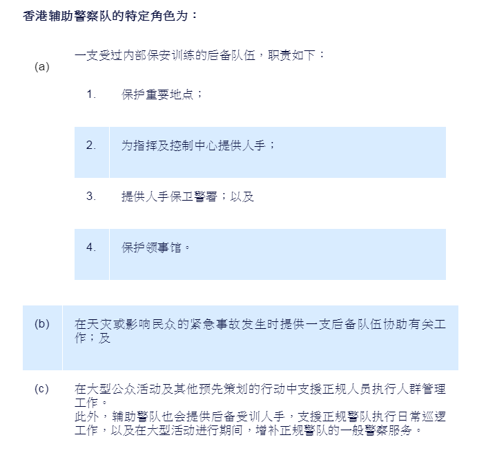 據香港警務處官網介紹,香港輔警隊由社會各階層的志願人士組成,於1914年成立。百餘年間,輔警隊一直履行成立之初的職能,即提供訓練有素的後備人手,在應對緊急事態時支援正規人員。輔警隊的組織及指揮架構已與正規警隊融合,遵循警務處處長按現行行動的優次而指派的支援形式和人數動員。