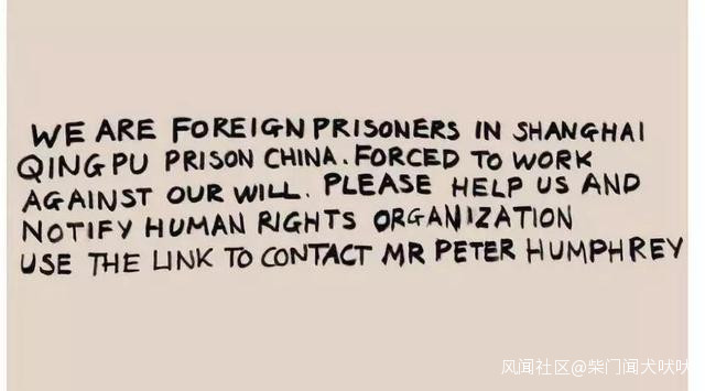 “我們是中國上海青浦監獄的一羣外國人,被強迫勞動,違反了我們的意願。請幫助我們通知人權機構,並聯系Peter Humphrey先生”。