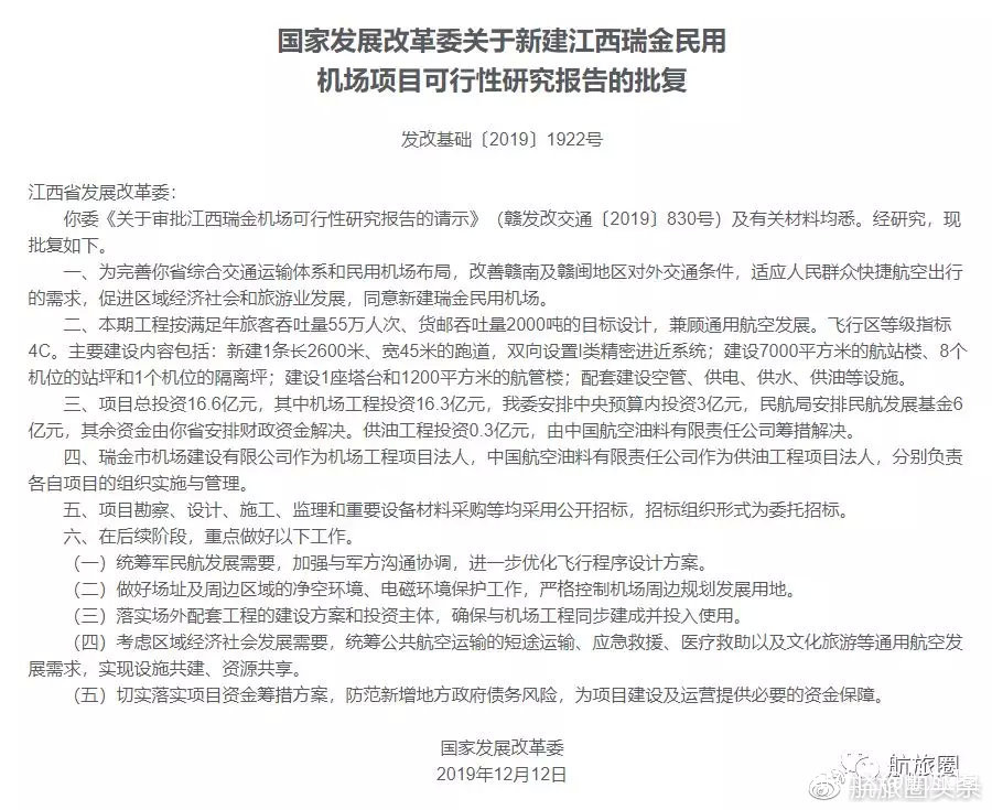 發改委網站今天發佈《關於新建江西瑞金民用機場項目可行性研究報告的批覆》,同意新建瑞金民用機場。